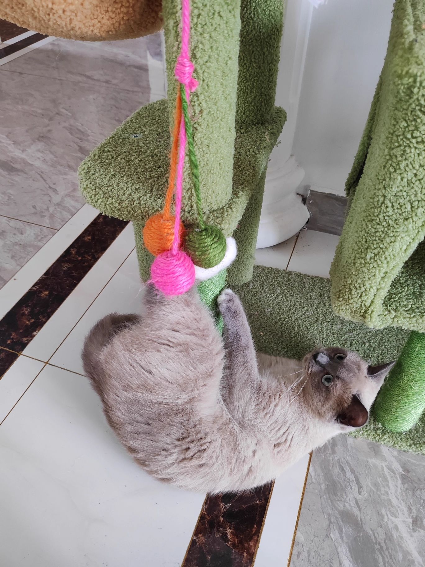 Hanging tricolor cat toy, rope ball, teeth and paw chew toy, with built in rattle. Beautiful and exciting for your cat.